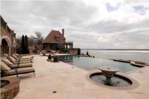 Calling all reality show producers: do I have a script for you! Take a 20,000 square foot Texas mansion built by an oil tycoon and his wife – I mean, ex-wife. OK, make that 19,337 square feet with 6 bedrooms, 6 baths, two half baths including one with a musical flushing toilet, two infinity pools, 6 living rooms, Moroccan media room, a guest house with three bedrooms, a caretakers home, Longhorn, cattle and horses and a barn (with full bar) to house them. There are even deer jumping (and getting stuck on) the fence plus rabbits, coyotes, snakes, critters, three mules, a horse, donkey, catfish and brim because the home is on the shores of Lake Grapevine. In fact, there are more than 450 feet of waterfront views of the lake from a 75 foot bluff, which is not only high for, but extremely rare in, Texas.