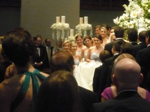 The moment we got wind of the security outside and walked into church, I could feel the power of the guests. Alan Peppard insists many were following the Kentucky Derby on iphones, but those guests must have been in his pew. Those around us were busy snapping iphone photos of the altar and the Dallas Symphony Orchestra. In the sanctuary were Lucy Billingsly, Caroline Rose Hunt and daughter, Laurie Sands, Lydia and Dan Novakov, Lt. Governor David Dewhurst and his wife, Tricia, Texas Attorney General Greg Abbott, Gene and Jerry Jones, Charlotte and Shy Anderson, Plains Bank honcho Alan and Lee Ann White, Chuck Norris, Annette and Harold Simmons, Elaine and Neils Agather, Phil Lacerte, Ken and Millie Cooper, Scott and Gina Ginsburg, Sam and Sonia Hamra, Jan and Jim Showers, Allie Beth and Pierce Allman, The Duke Jimersons, Tom Leppert, Michelle and Bernard Nussbaumer and beautiful daughter Nile escorted by my “second son”, Clayton Floyd, Janet Roselle and hubby, the Crawford Brocks, Carl and Peggy Sewell, Barbara Daseke and her husband, Don, who is running for mayor of Addison, and so many more guests I am getting dizzy trying to recall — 1000 easy. Oh yes, Mark Seal flew in to cover the event for Vanity Fair; the late Dominique Dunne wrote up Kim’s wedding for the pub. Mark is, by the way, married to ob/gyn Laura Blocker who trained with my husband. They live in Aspen.