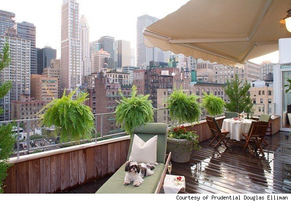 It started in — you guessed it — New York City. According to my friend Ann Brenoff at AOL Real Estate, Tristan H. Harper, senior vice president of New York’s Prudential Douglas Elliman agency, uses designer dogs to sell property. In fact, he sold an East 63rd Street penthouse for a record $3.75 million in 2008 after this photo (above, terrace) of Rocko the Shih Tzu was published everywhere.