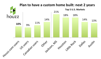 – Southerners remain bullish on custom homes. Homeowners in southern states are twice as likely as those in other regions to have built a custom home in the last five years, and to be planning one in the next two years. A whopping 21 percent of Jackson, Mississippi homeowners surveyed is building the home of their dreams from scratch.
