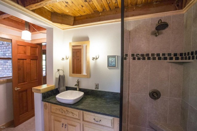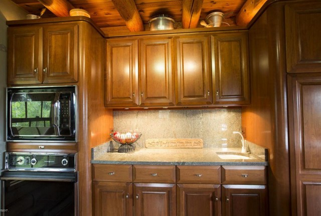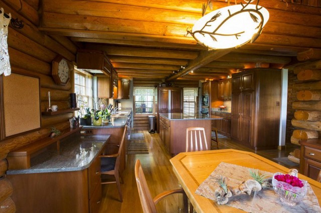 Inside, the kitchen fits the rustic vernacular but is quite modern. There are lots of windows to take in these scenic views:
