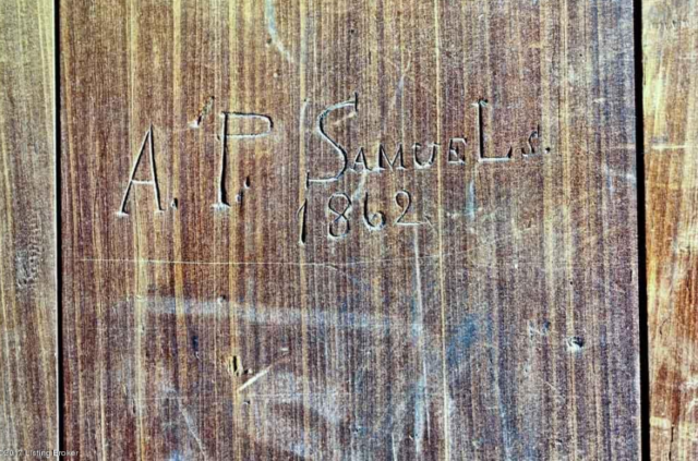 The home retains traces of the James brothers time there, said listing agent Marsha Clark, who says there is a ceiling hatch believed to be the way Jesse James escaped the law, and inscriptions and initials are carved into the plaster walls, dining room window sill, living room fireplace mantle and carriage house door.