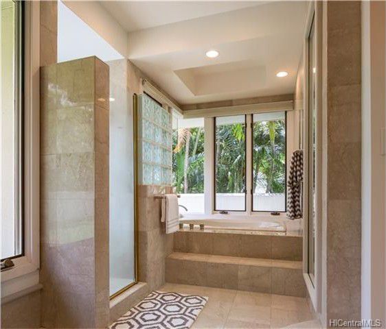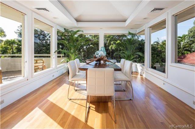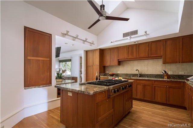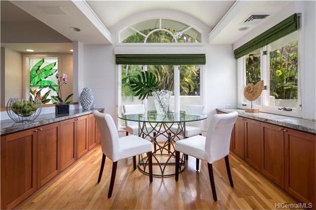 The kitchen probably remodeled by McVie with skylights, wood cabinetry (very popular in tropical Hawaii who aren’t as obsessed with hospital white kitchens) and Rainforest stone countertops. There’s a 6-burner range, double ovens and giant Sub Zero fridge. The archway leads to the breakfast nook.