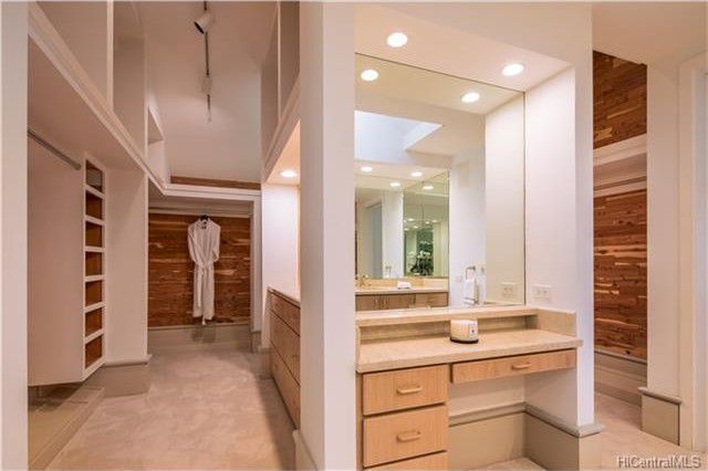Actually, if you want sunrise, it’s visible from the master bath windows. And yes, the master bath is just as large as you’d expect. In fact it’s multiple spaces. Here we see the long double vanity with a peek at the make-up table on the right. Through the doorway is the water closet with bidet plus the shower and bathtub. Yes, the cabinetry is circa 1989 and a buyer will probably update much of this home, but the space is quite well done.