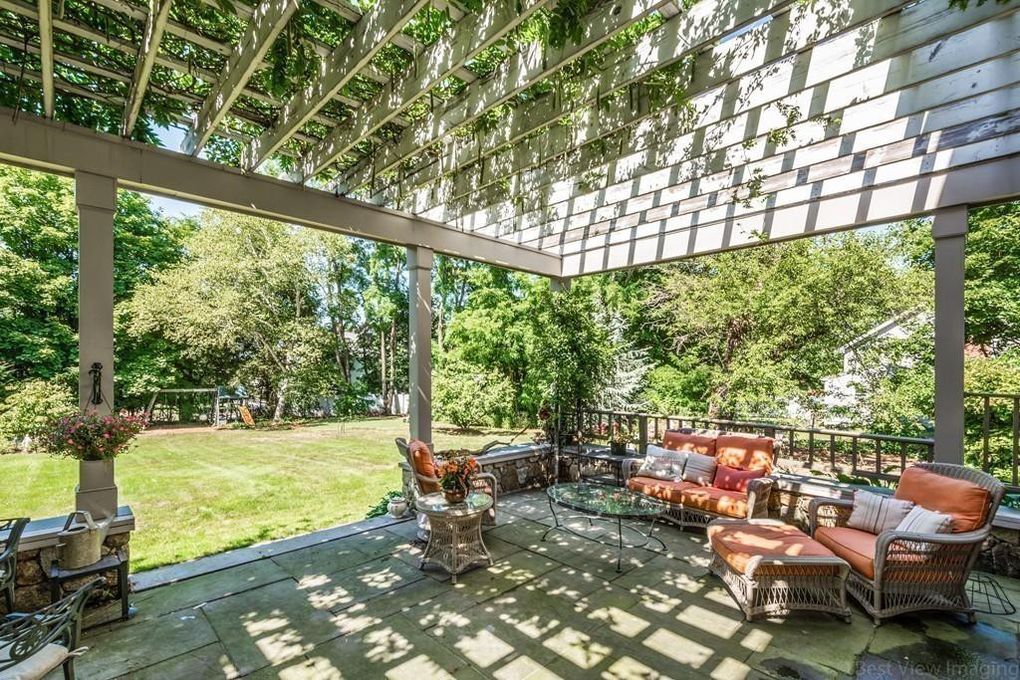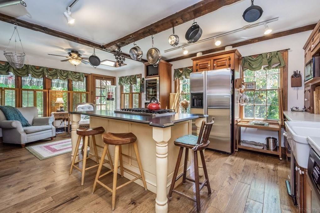 The home has three staircases, five bedrooms, three-and-a-half baths, and seven fireplaces. It also includes an artist loft, multiple backyard spaces and gardens, a deck off the kitchen, and a white wisteria pergola on a stone patio perfect for al fresco entertaining.