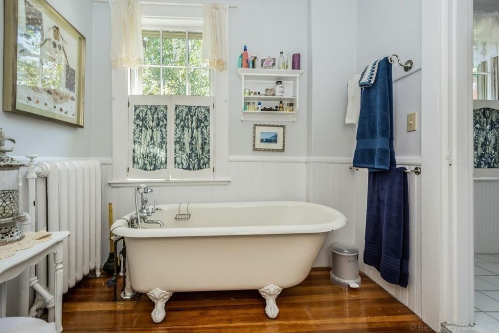 “The central section of the house follows a traditional five-bay, center entrance plan of two stories with two rear (north ) chimney stacks typical of the Federal period form of the early 19th century in Canton,” the documentation found in MACRIS said, adding that the design is Federal style with “elements of older Georgian style as seen in the tight gable eaves and interior features,” like the center stairway with block cap newel posts and scroll pattern stair ends, and in the surviving fireplace mantels in the left parlor and second floor bedrooms.