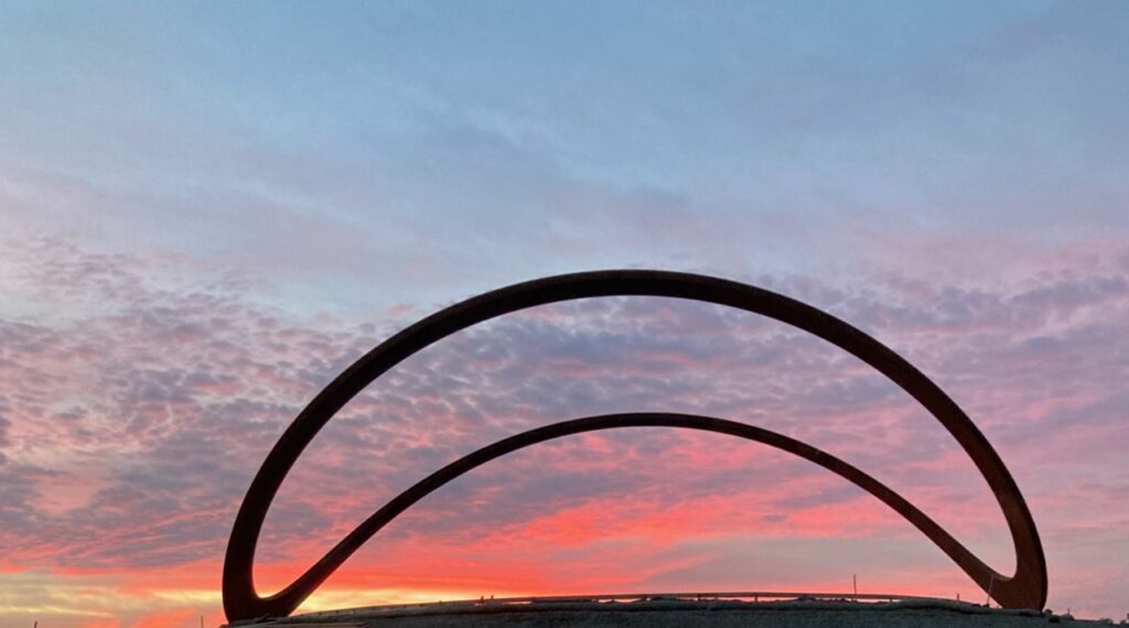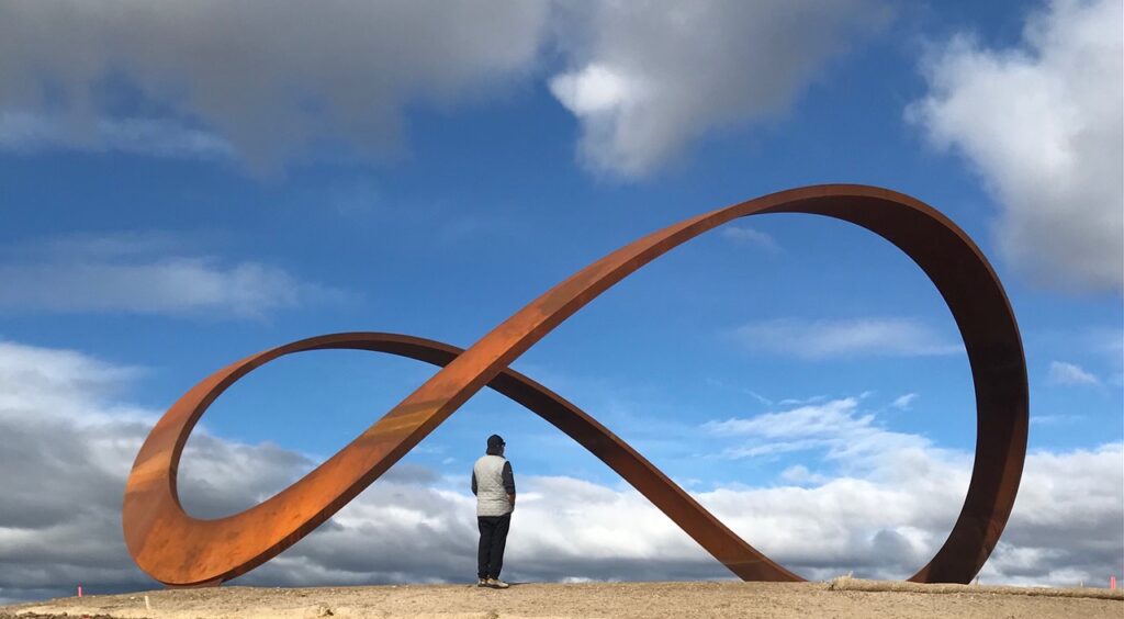 The Cor-Ten steel continuous loop is 60 feet long, 20 feet high, and 40 feet wide, and will gain a rust-colored patina to complement its natural setting. The huge piece is intended to welcome guests and provide a calming effect conducive to yoga, meditation, picnics, and other gatherings.