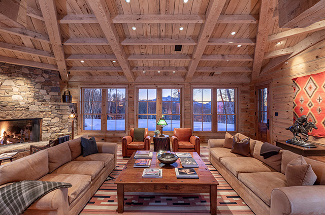Warm wood is featured throughout the interior—think furnishings, flooring, walls, even the kitchen’s counters and island. The family room has a vast stone fireplace made by local craftsmen.