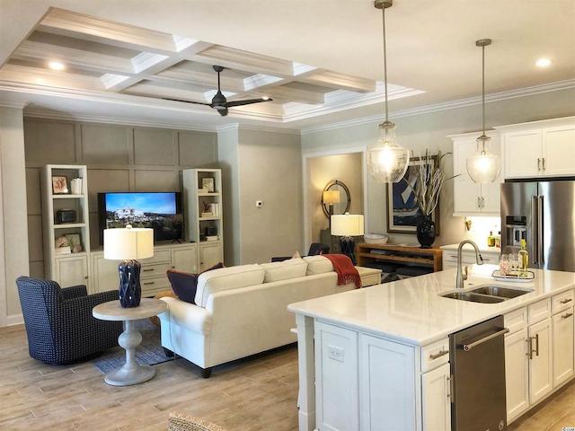 The home itself is meticulously maintained. Every bedroom is en-suite and there are thoughtful touches throughout to make you feel right at home. A quartz KitchenAid kitchen, wood-look tiles, coffered ceilings, and an exposed beam master with spa-bath add to the appeal. But perhaps, best of all, is the covered porch!