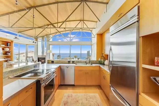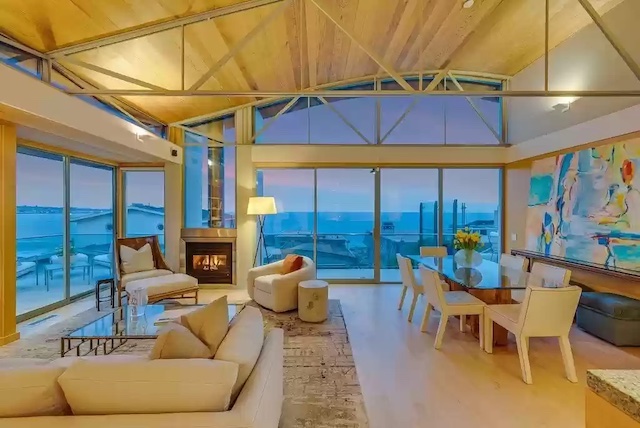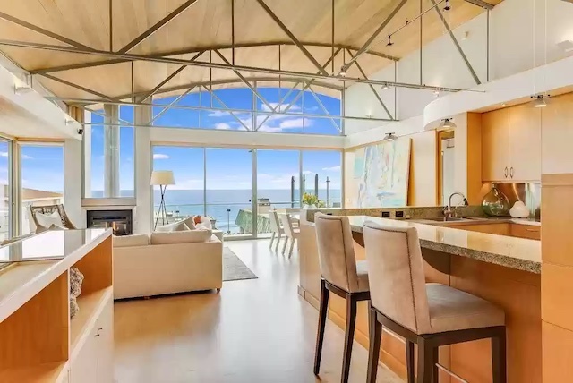Next up, our steal. For nearly half the price you could find yourself basking in majestic views of the California coastline from this three-bedroom, three-bathroom contemporary. Walls of glass blur the lines inside and out, met by gracious terraces for whale and dolphin watching. Even better, you can walk to the beach! Per the listing, “Enjoy beach walks, surfing, paddle boarding, biking trails and more.”