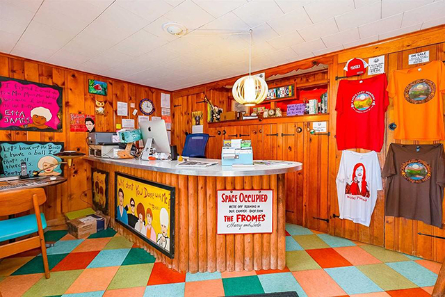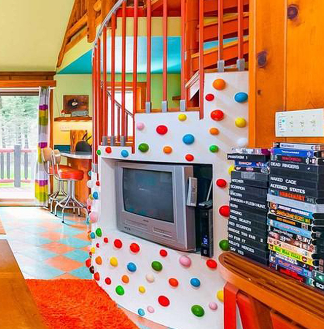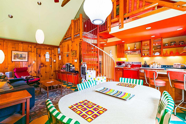 Rooms explode with color. Design features include checkerboard vinyl flooring, painted wood paneling, and fabulous fifties style kitchens. One cabin has a multi-hued polka dot spiral staircase complete with built-in television.