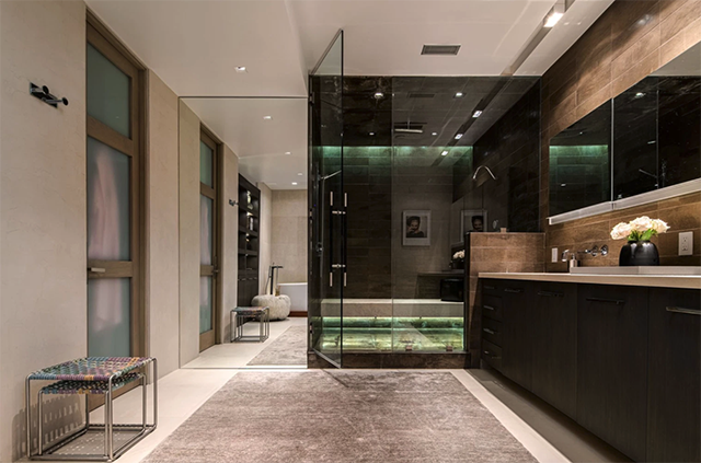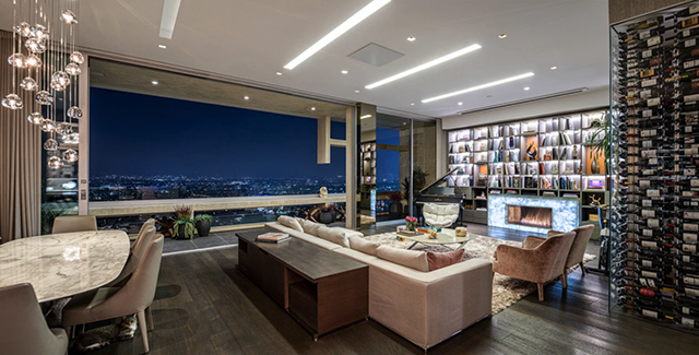 In the living room, an eco-smart fireplace is surrounded by crystal quartz. A custom glass wine cellar holds 300 bottles.