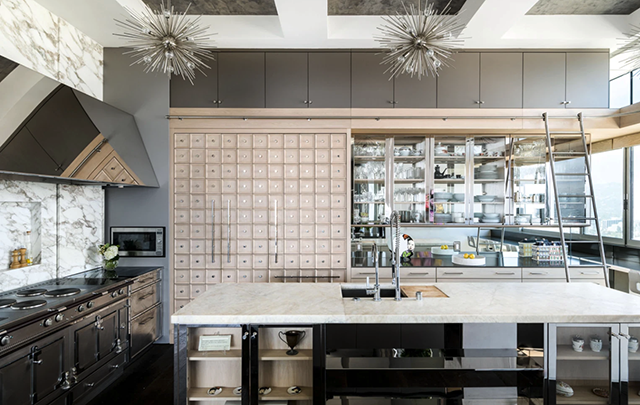 The de Giulio kitchen sports a crystal quartz island, sliding Calcutta marble backsplash, and custom La Cornue range. “It’s one of the most-photographed kitchens in the world,” according to co-agent Scott Segal.