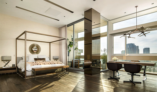 Highlights of the I.M. Pei architectural masterpiece include 12-foot ceilings, French fume-finished white oak wood floors, custom millwork, and Holly Hunt decorative light fixtures. An expansive balcony offers sweeping views of the Hollywood sign, Griffith Observatory, and the Pacific Ocean.