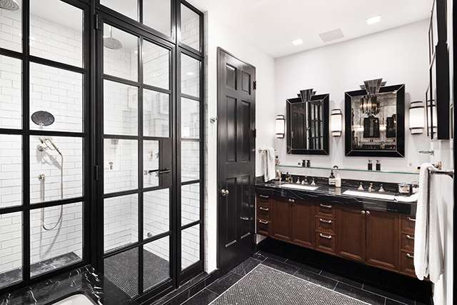 The main entrance is through a grand front door atop a classic stoop. The five-bedroom, six-bath home also has a home theater, workshop/gym, wine cellar, and a playroom for the couple’s 10-year-old fraternal twins, Gideon and Harper.