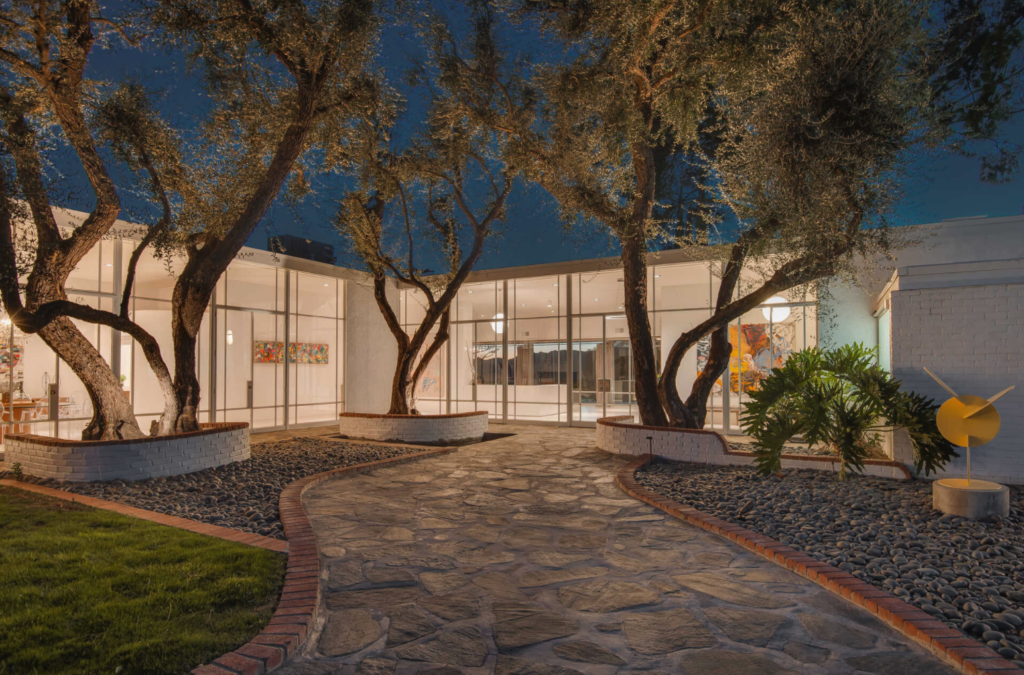 Originally built in 1951 for Chase Manhattan Bank heiress Dora Hutchinson, the pedigree suburban Los Angeles compound was designed by Pereira Luckman AIA—the same architects behind LAX’s iconic Space Age Structure. “The spaces are immediately impressive thanks to the distinctly mid-century construction, large floor-to-ceiling windows, and elegant courtyard that boasts a stone walkway leading from the driveway to the front door,” according to Architectural Digest.