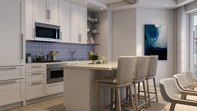 The residences themselves sport an elevated beach- and bay-inspired aesthetic. Light-filled living rooms open up to private balconies with travertine gas fireplaces. Additional features include Wolf, Bosch, and Sub-Zero appliances, a 42-bottle wine refrigerator, European oak floors, wood-beamed ceilings, and ship-clad wall panels.