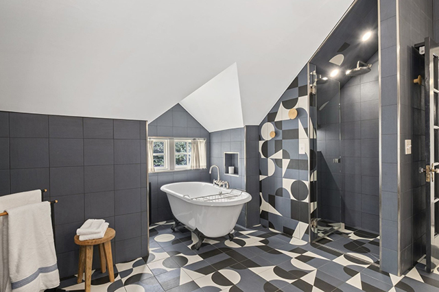 On the upstairs level, a quirky primary bedroom has two seating areas — one next to a set of windowed doors and another, cozier one under a peaked ceiling. An adjacent primary bath sports funky geometric tiles on the floor and walls, along with a clawfoot bathtub and standing shower.