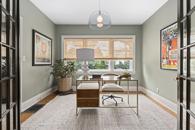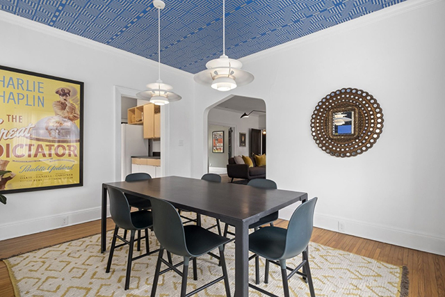 Highlights of the home include a green front door leading to a white-walled living area with an arch-shaped fireplace. Off to the side, the dining room sports a blue and white-patterned ceiling. The first level also features a windowed kitchen and home office.