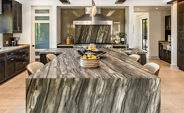 A chef’s kitchen sports high-end appliances, dark brown cabinetry, and a black marble island and bar. The adjacent dining area opens up to a spacious wood-floored family room.
