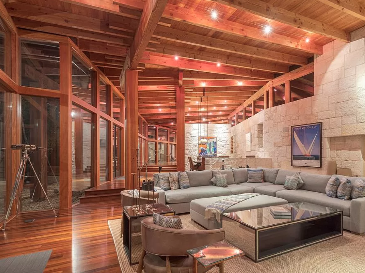 “On 6.4 acres along the north shore of Lake Travis, architect Mell Lawrence has designed an award winning contemporary waterfront home from natural materials. Inviting the nature that surrounds it, this home displays locally quarried limestone, hardwood flooring, fir beam ceilings, clerestory & wall-to-wall windows that embed clean lines and natural light for an airy wooded ambiance.”