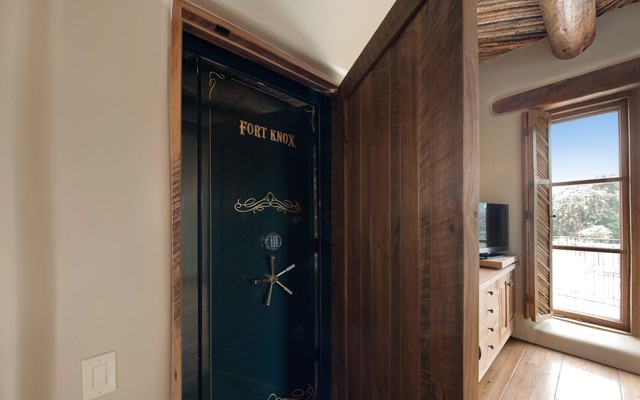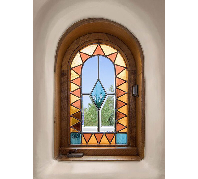 Among the highlights: 14 hand-sculpted masonry fireplaces — 11 inside and three outdoor, each with custom-designed screens. The property also features Tull’s signature stained glass windows, saguaro cactus rib shutters, and exposed adobe walls.