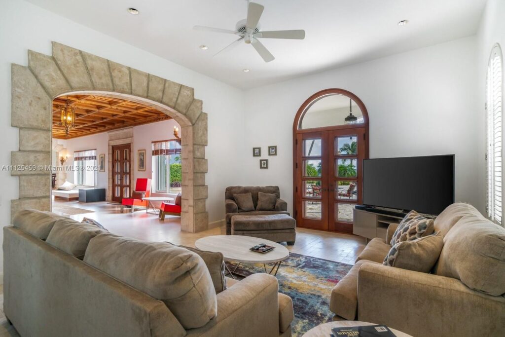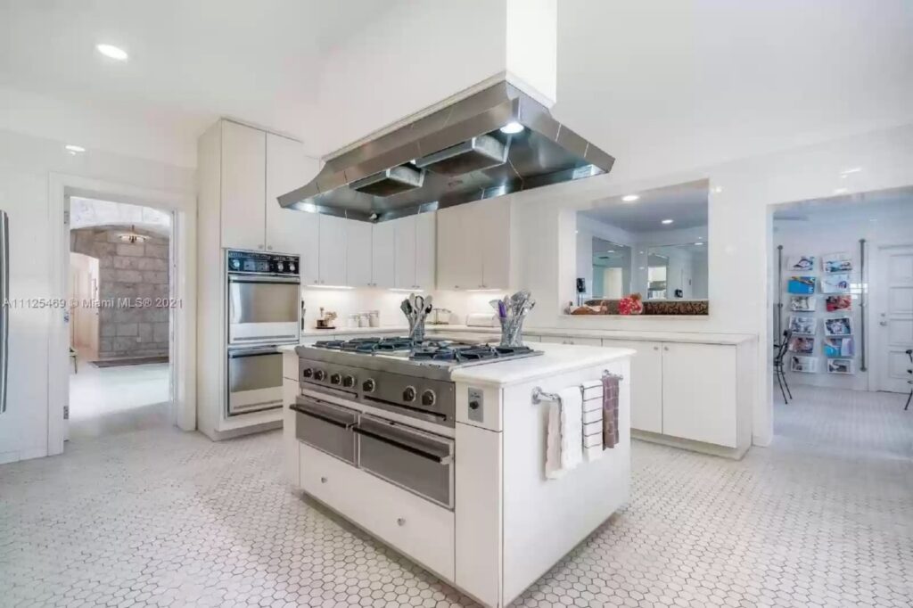 Inside, there’s a grand coral staircase, spacious kitchen, and a great room with intricate custom woodwork. An added bonus: Gunther’s gold-frame portrait sitting on top of the fireplace.