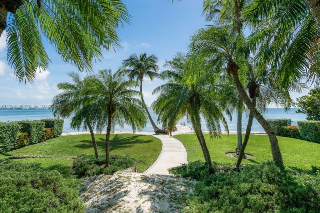 Situated on 1.2 acres, the gated manse is one of only six in this exclusive enclave. Selling points include 100-feet of water frontage, a private dock, spectacular bay views, and lush landscaping.