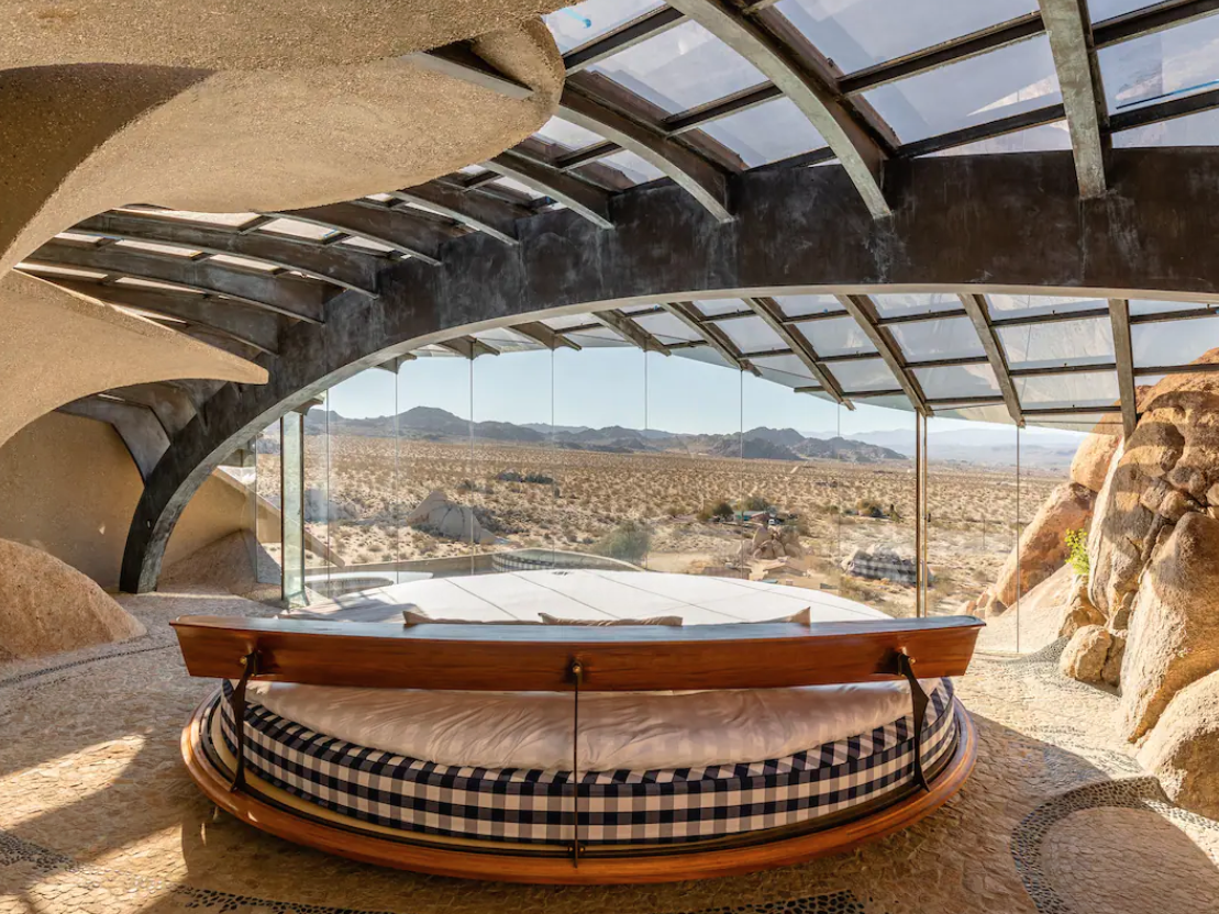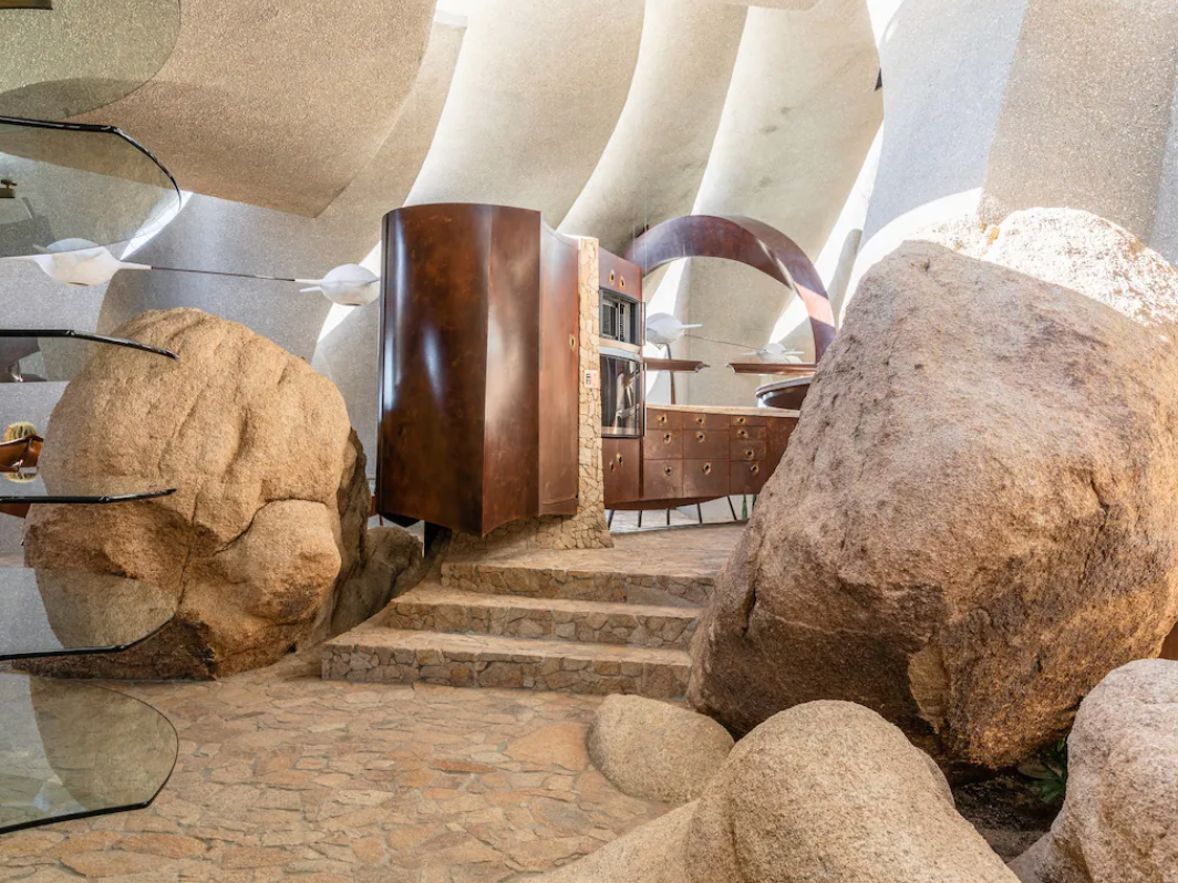 This house can only be described as a work of art. An acme of organic architecture, both the interior and exterior are all fluid lines, earthy materials, and interesting textures. Nearly every element of the home is handcrafted by architect Ken Kellogg (a former protege of Frank Lloyd Wright) and Master Craftsman John Vugrin. An easy drive to the entrance of Joshua Tree National Park, it’s apt that this home’s setting is the California desert that has inspired many free-thinking artists.