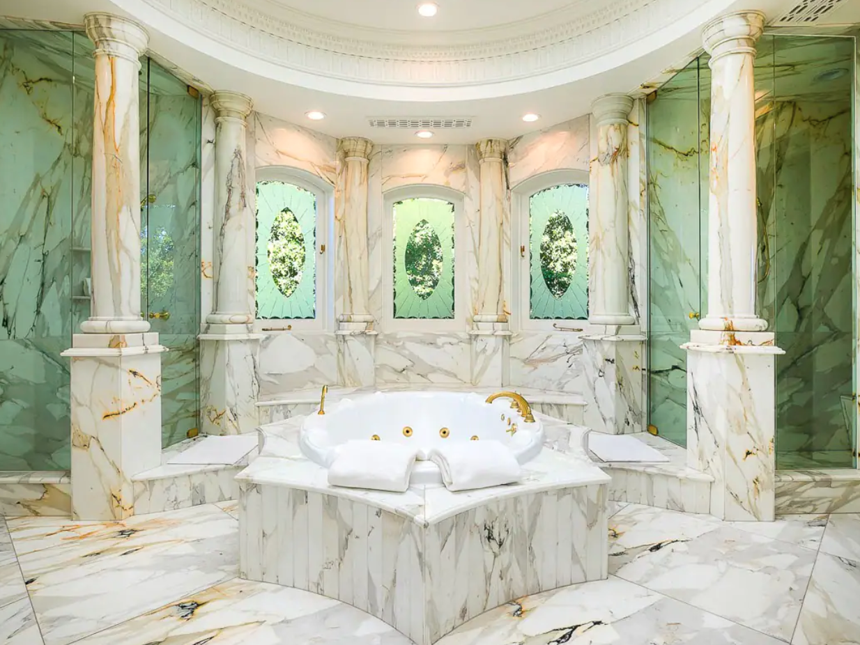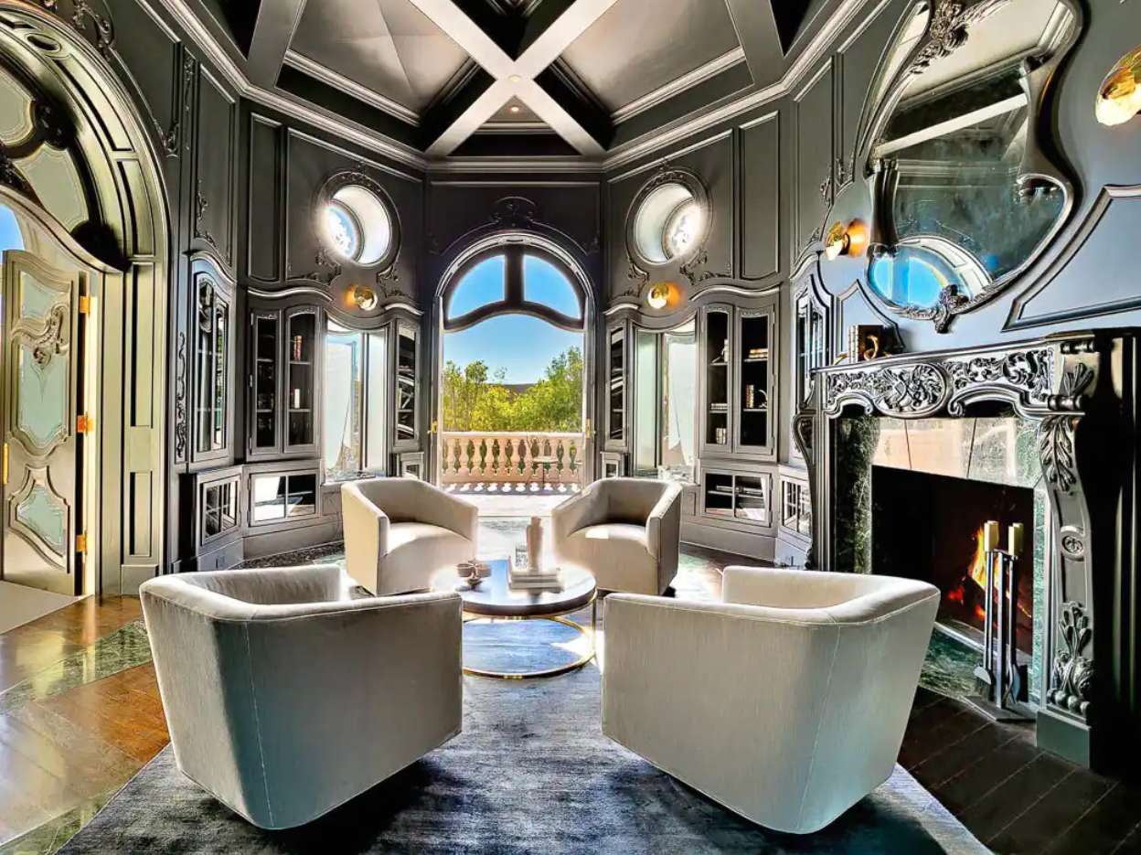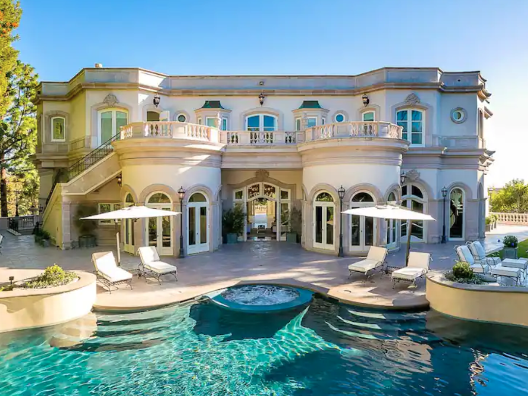 For those that want to be a modern-day Beverly Hills Marie Antoinette, this classical French-style estate fits the bill. There are eight bedrooms and plenty of space – including glamorous double staircases, sexy, dark wood-paneled studies, a wine cellar, and a tennis court.