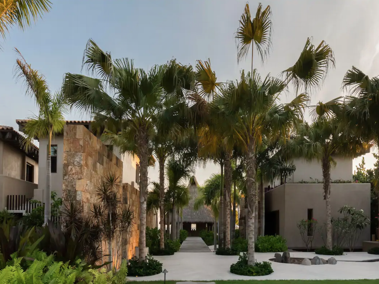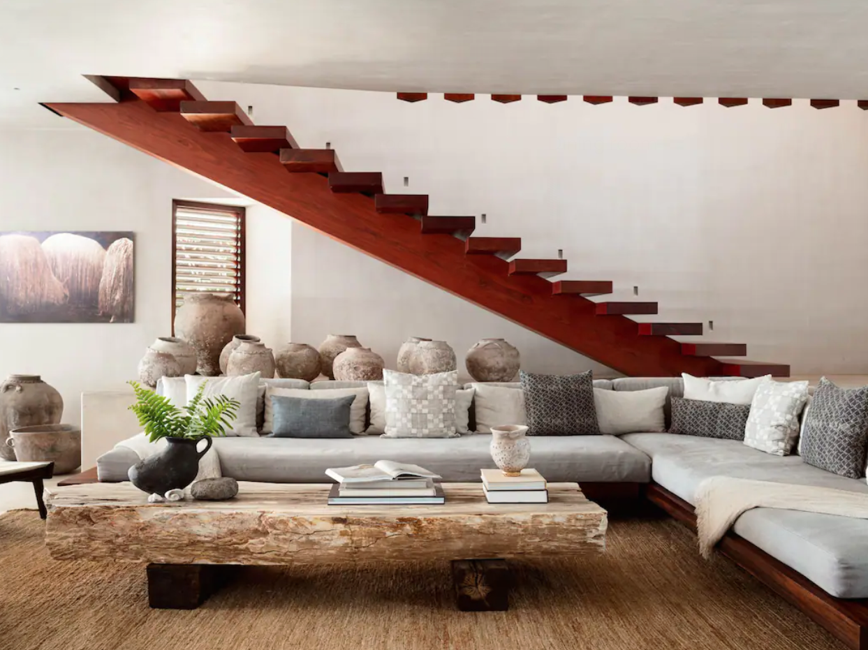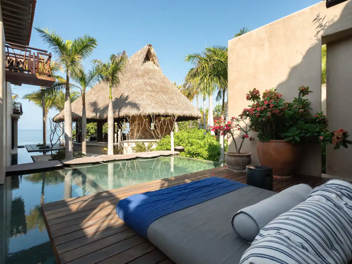 This extravagant Punta Mita home mixes classic tropical, Mexican architecture with modern style. For example, there’s a hay-thatched roof over the poolside cabana, but there’s also a floating stairs situation in the living room.