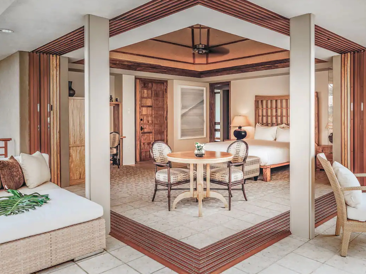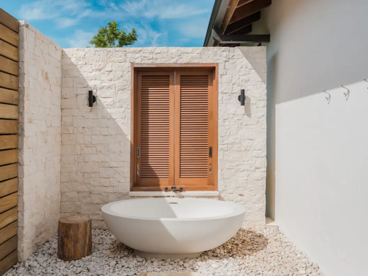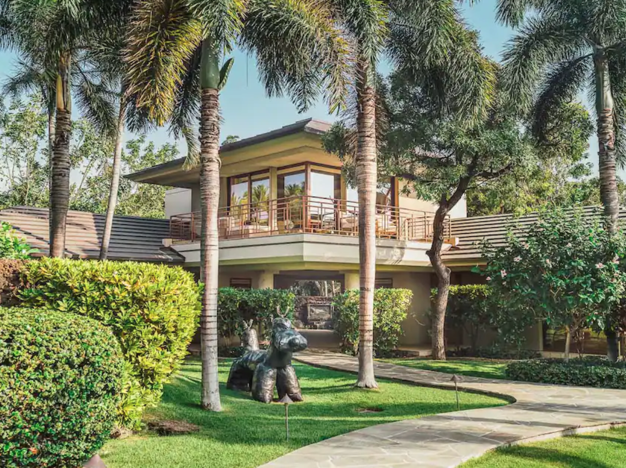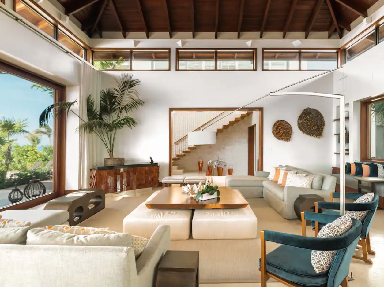 Renting this Airbnb is like renting out your own luxury resort in terms of style, amenities, and the fact that the oceanfront property comprises four distinct houses. There’s a vintage tiki bar and home gym with a steam room as well.