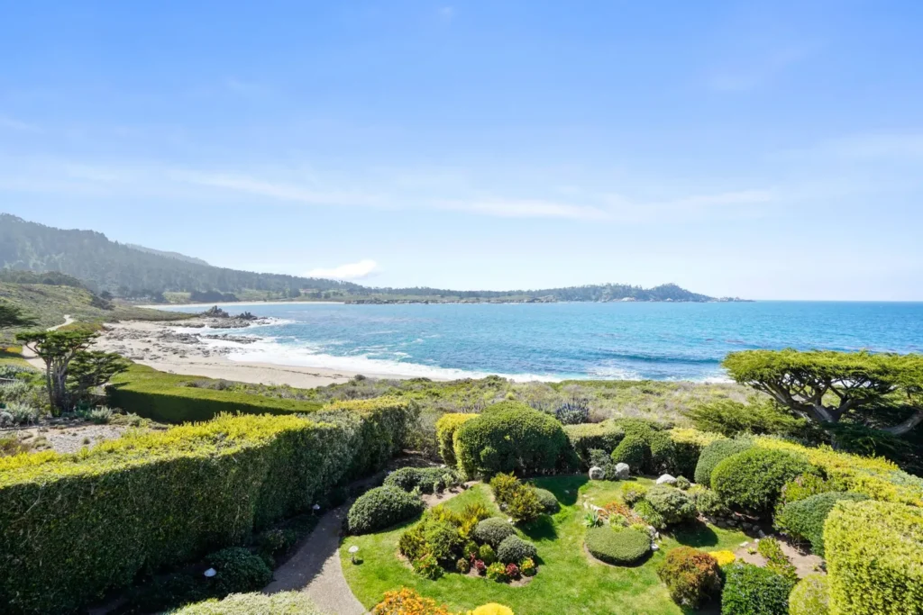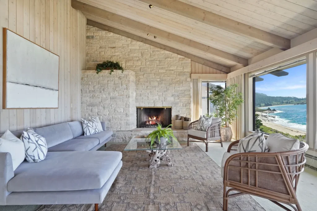 Located on a high bluff above Carmel Bay, the 3,621-square-foot midcentury masterpiece overlooks Point Lobos Nature Reserve, Ribera Beach, and Monastery Beach. The Sotheby’s International Realty listing credits architect Richard Hicks for the panoramic ocean and coastline views.