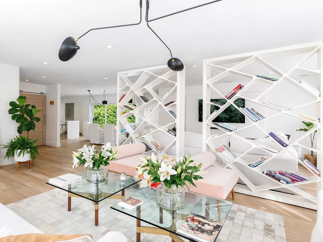 Low, light, and bright, surrounded by palm trees, this home is giving a midcentury Palm Springs vibe. Inside the four-bed, four-bath home there are several playful, artistic features — such as the geometric, freestanding bookcase that really steals the spotlight in the living room.