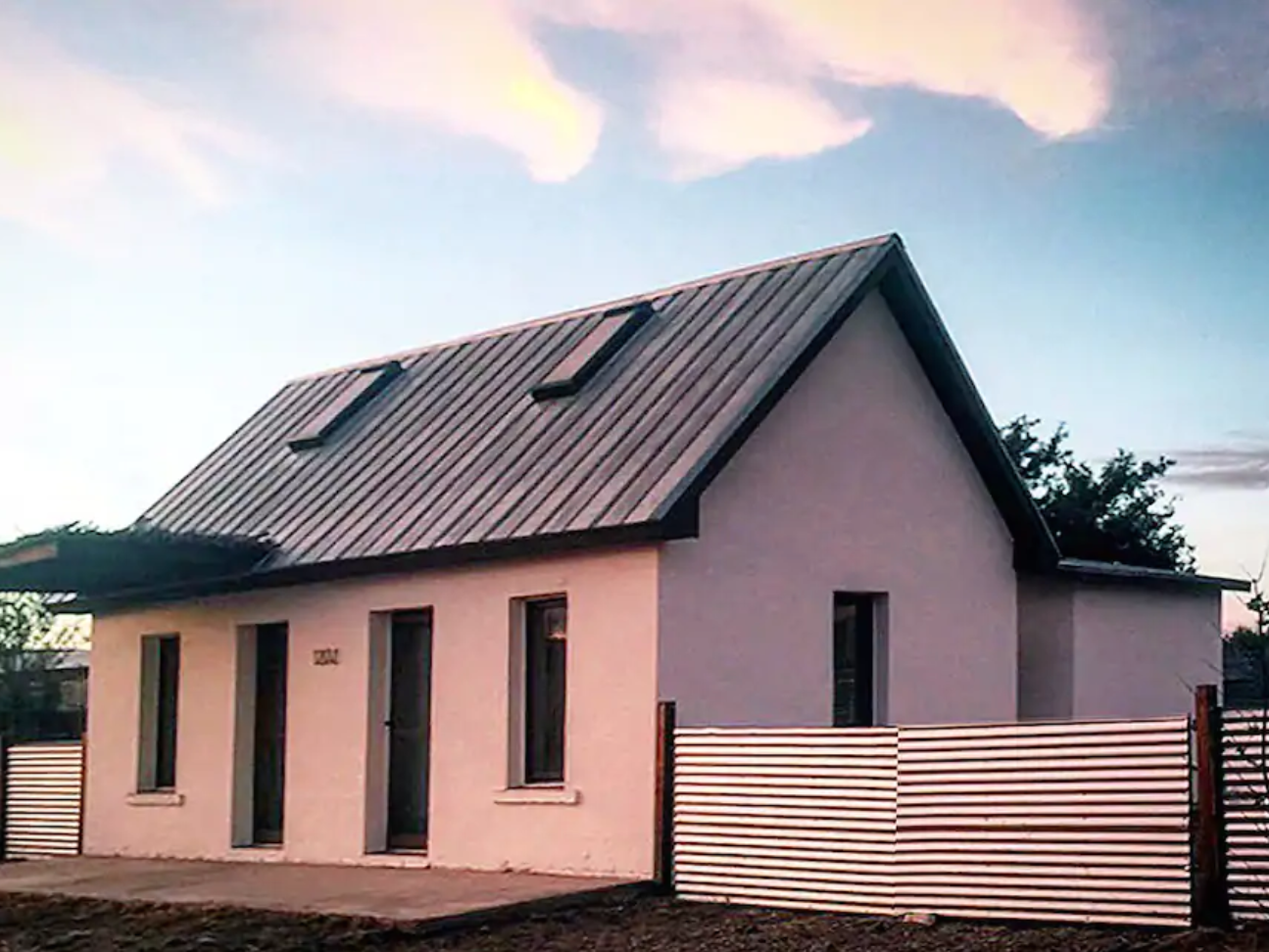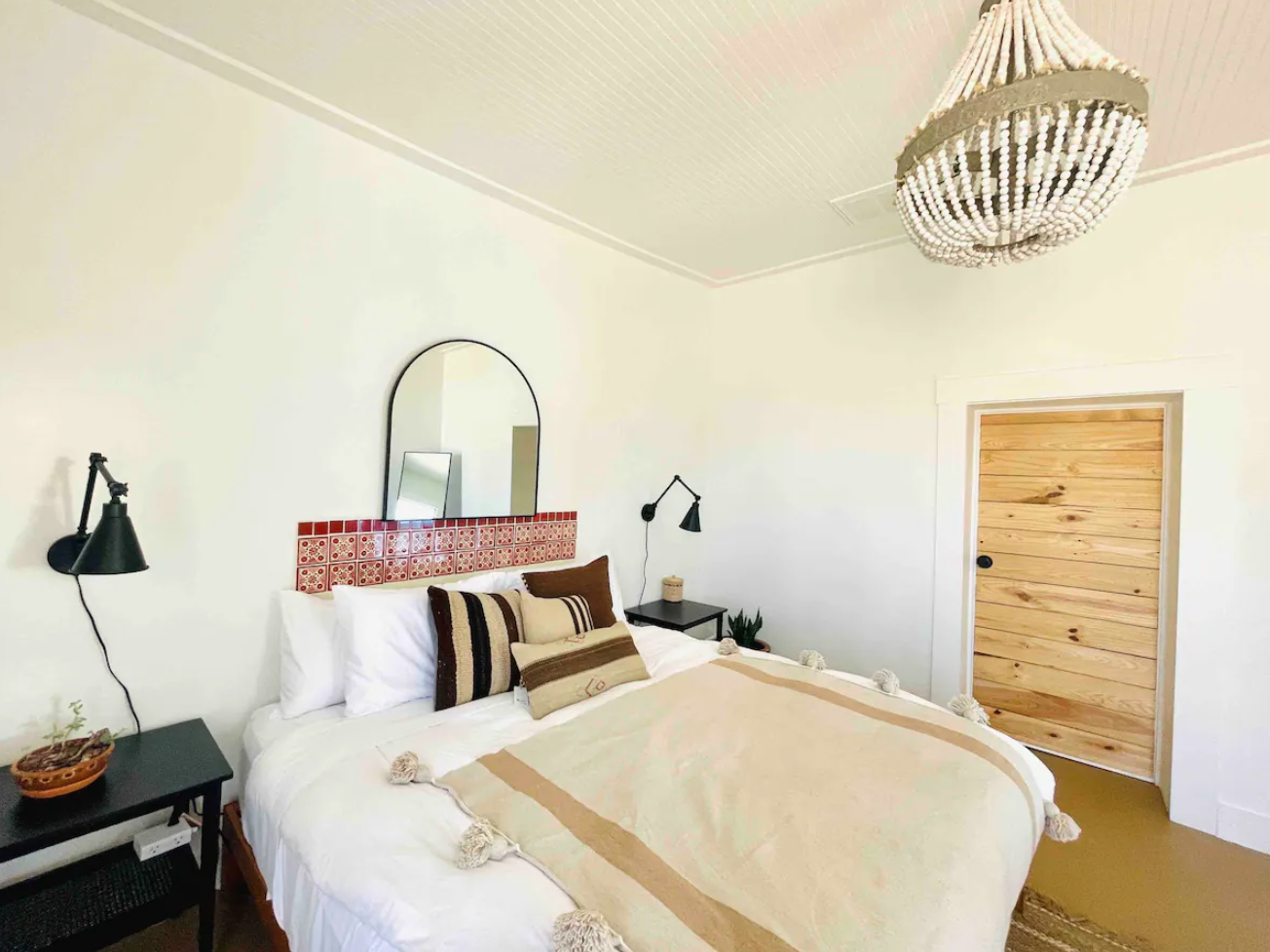 This Airbnb enjoys a prime, walkable location near Marfa’s downtown. Built in the 1940s, the roof is a unique gambrel shape (very farmhouse-chic) and is built with adobe walls. The interior glows sparkling white with thoughtful pops of desert-inspired color.