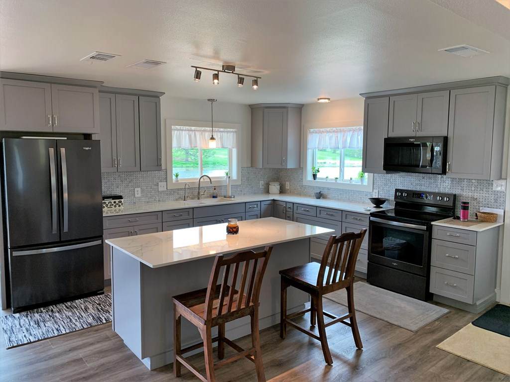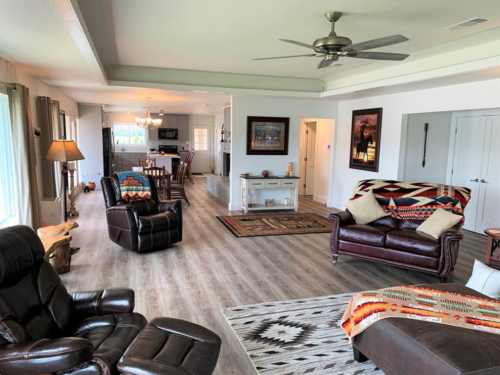 The main home on this property features an open comfortable flow. Also, updated flooring and fixtures give it a modern look and sleek feel. The living, dining, and kitchen area blend seamlessly. Therefore, you feel as open and free inside as you do outside.