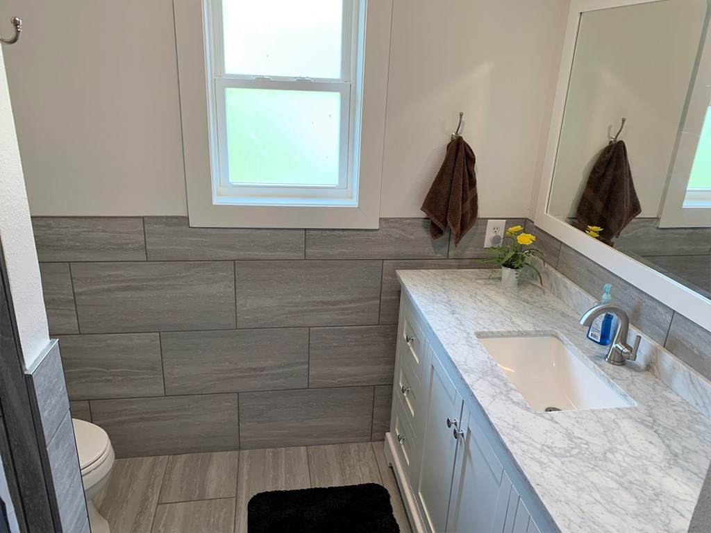 The primary bedroom is cozy and inviting. In fact, all the rooms in this home feel very welcoming with big windows and nice views. Then, the bathrooms are all beautifully updated with marble and tile touches.