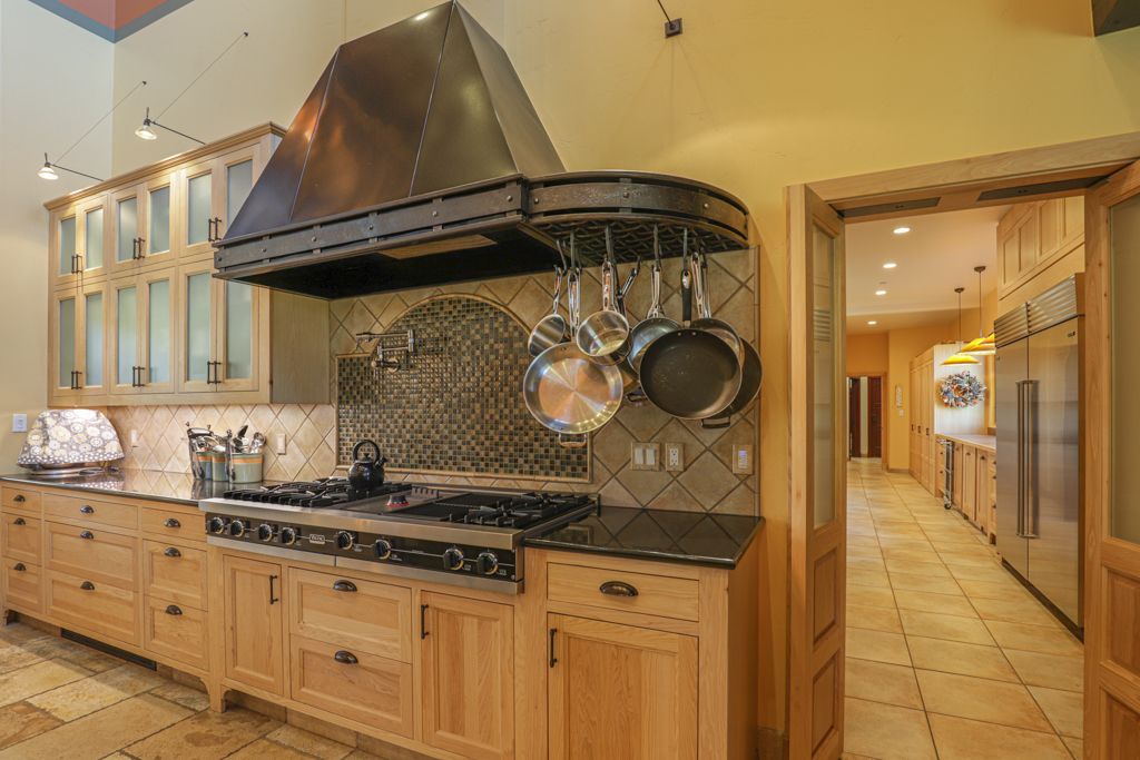 Next, a formal dining room can host family holiday meals and stately dinners and opens to a dine-in chef’s kitchen with a butler’s pantry. The kitchen features granite countertops, custom cabinets, and premium appliances including a Viking oven, gas range, oven warmers, and Sub-Zero refrigerated drawers.