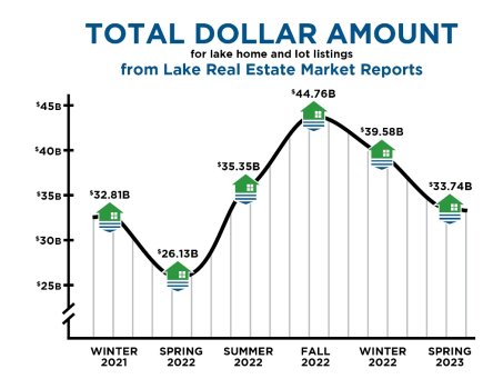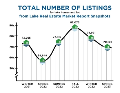 For potential lake home or lot buyers, the options are much better this spring than a year ago. According to the Spring 2023 Lake Real Estate Market Report from Lake Homes Realty, 70,101 lake home and lot listings are currently on the market, totaling $33,739,943,882. These statistics are up from the 59,849 listings for $26.134 billion in the Spring 2022 report. In Spring 2021, $28.8 billion in lake home and lot listings were for sale. These statistics are pulled from the quarterly Lake Real Estate Market Reports compiled by Lake Homes Realty from the 34 states covered on LakeHomes.com.