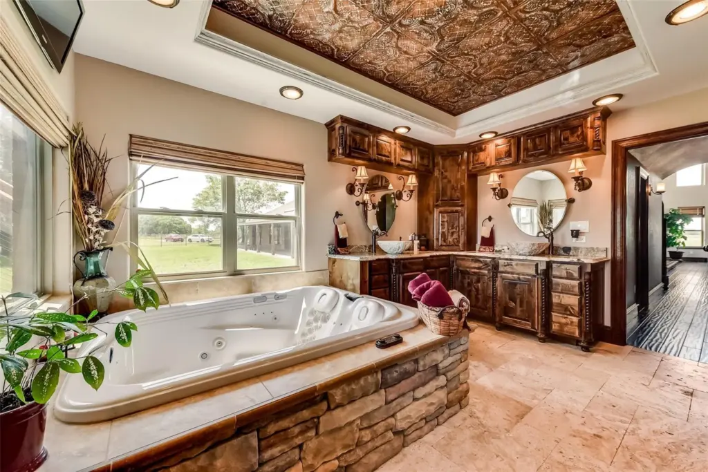 The primary suite is like a luxury ranch home in itself. It features a cast stone fireplace, dual walk-in closets, a coffee bar, a soaking jet tub for two, and heated floors. “It’s a John Dutton-worthy place, no doubt,” Roan said.