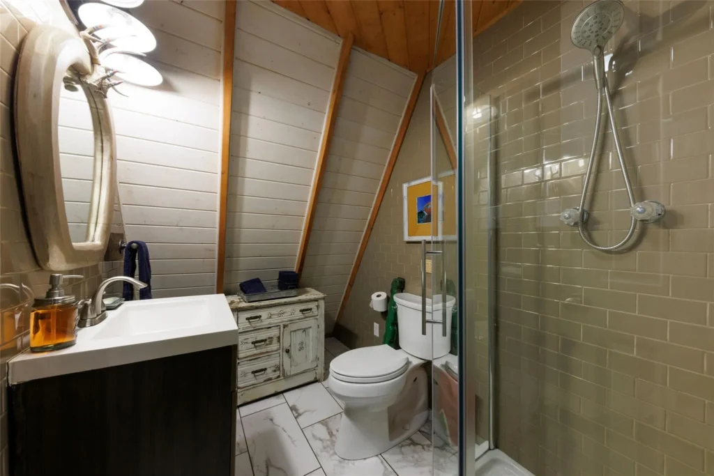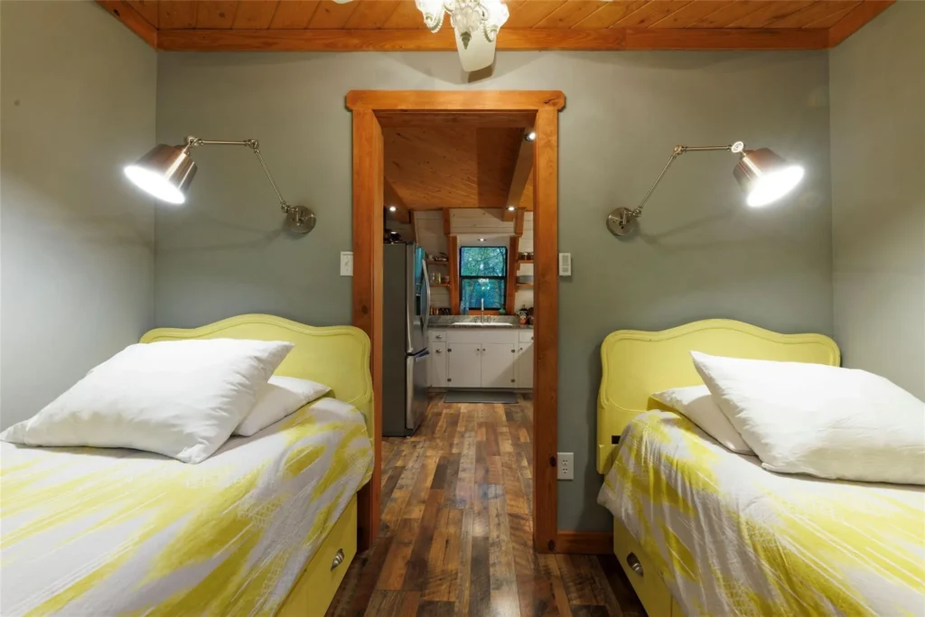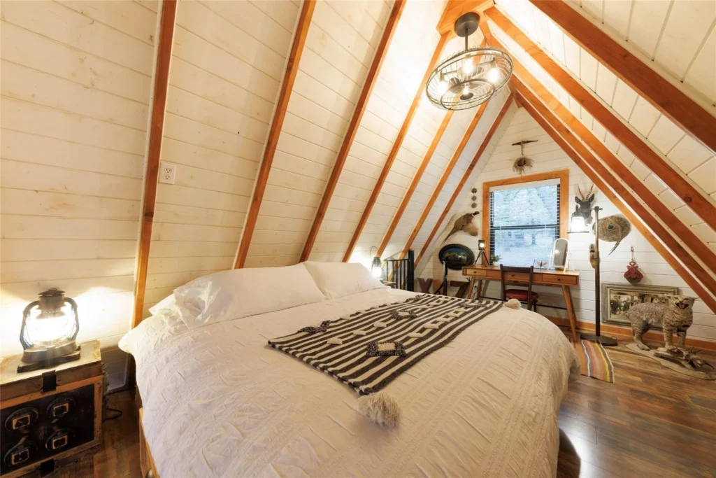 This cabin contains a bedroom on both the first and second floors. Each of these spaces is cozy and feature a ton of natural light from the windows throughout this property. The second-floor bedroom is loft-style, allowing for flexibility of function.