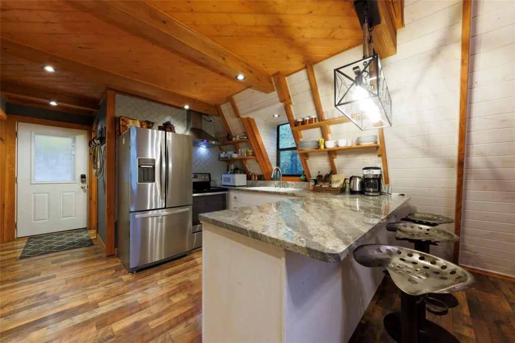 Then, the kitchen includes thoughtful updates with granite countertops, stainless steel appliances, and more incredible nature views.