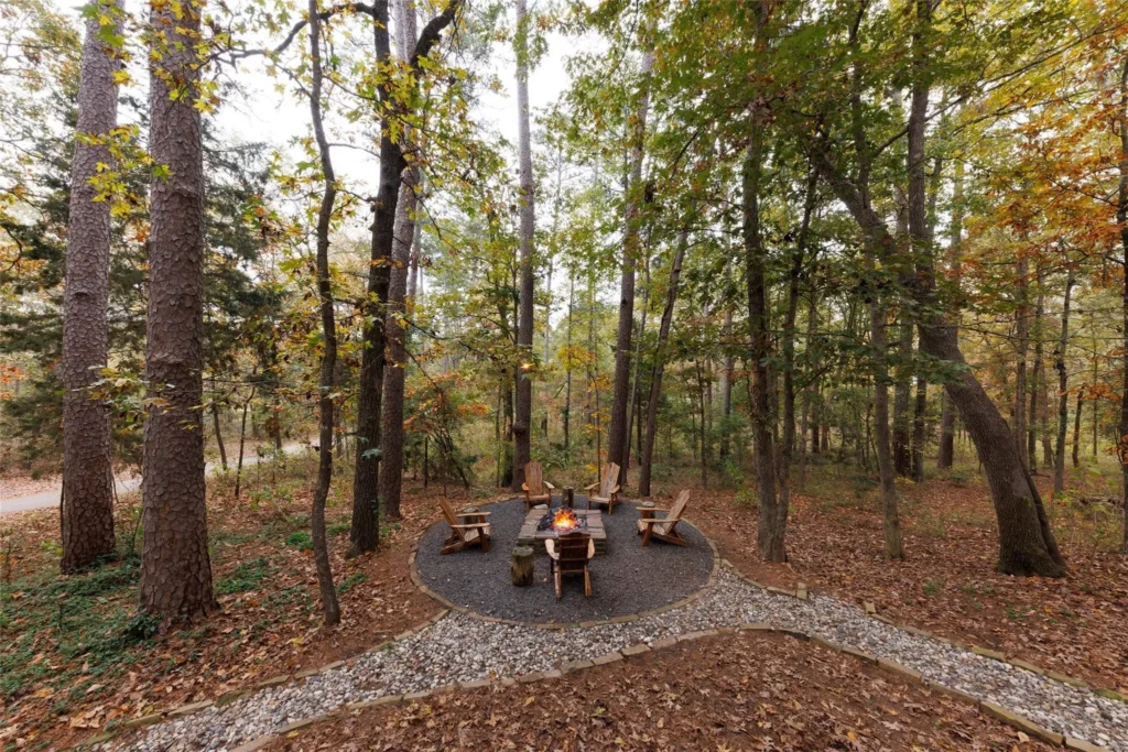 Of course, the exterior features of this home create some of the most compelling highlights. With an elevated deck, stone pathways, a firepit, and an abundance of mature pine trees, live oaks, and dogwoods, those who love nature will feel right at home.